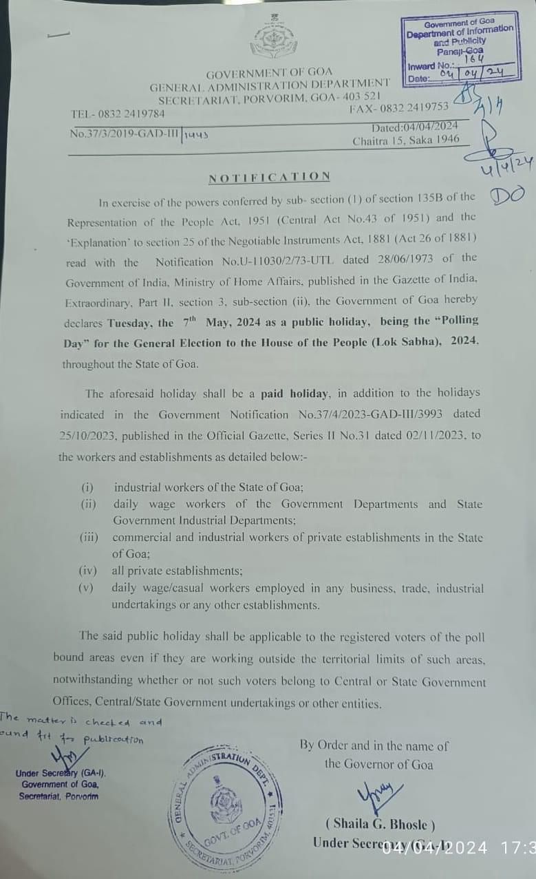 | 1 | Download | Declaration of paid holiday due to loksabha election-2024 in Goa | Admin | 2024-04-17 11:18:45 |